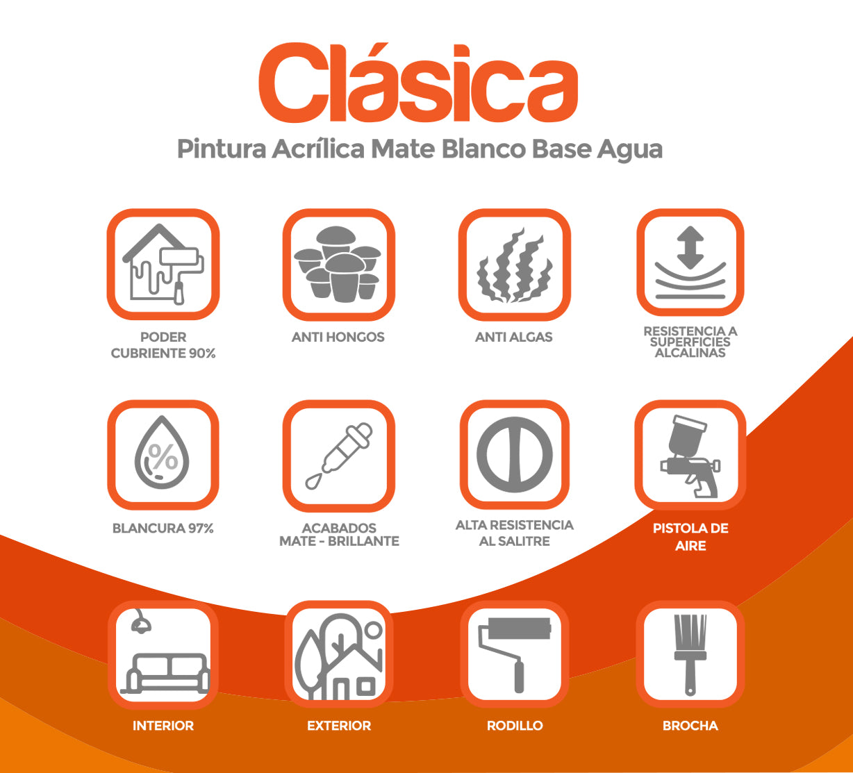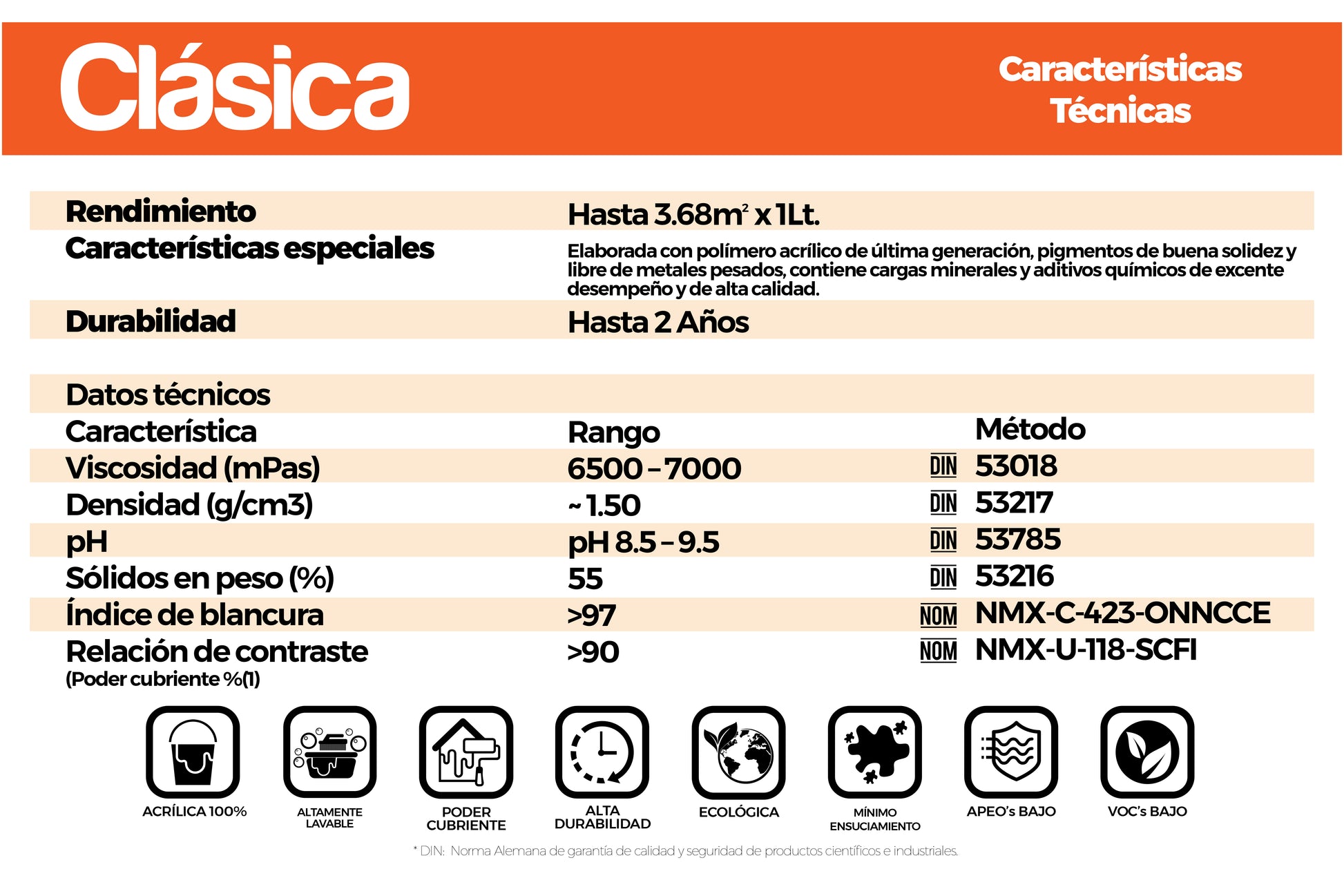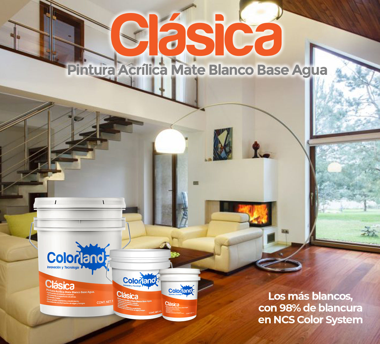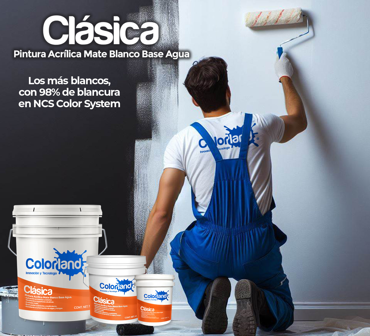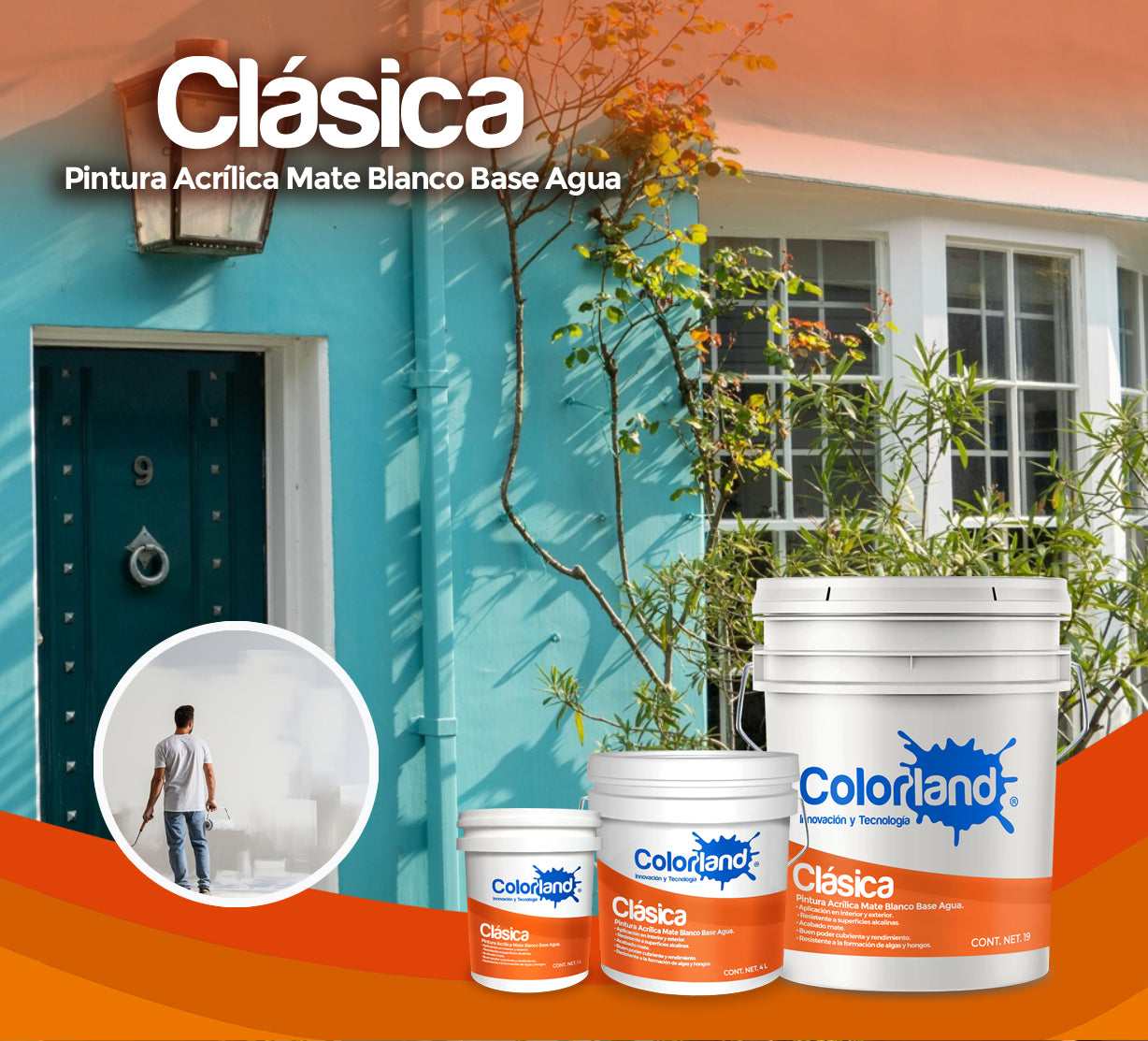 Colorland® Clásica es una pintura acrílica arquitectónica de uso general, fabricada con polímeros modernos y sin metales pesados. Su fórmula incluye pigmentos de buena solidez, cargas minerales y aditivos que garantizan acabado uniforme y buena cobertura.