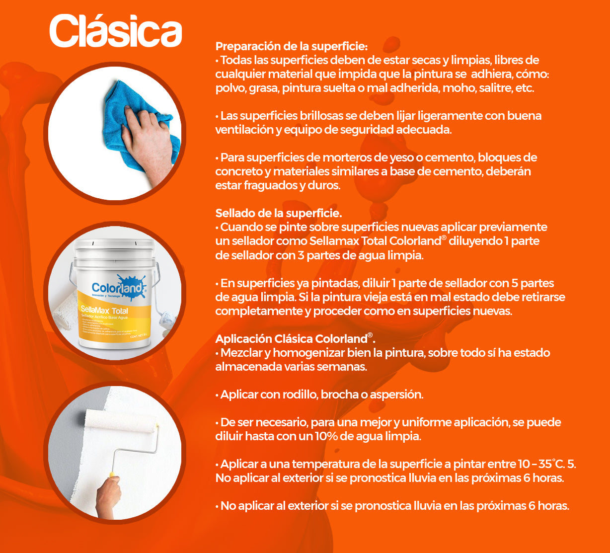 Sellado de la superficie. Cuando se pinte sobre superficies nuevas aplicar previamente un sellador como Sellamax Total Colorland® diluyendo 1 parte de sellador con 3 partes de agua limpia. En superficies ya pintadas, diluir 1 parte de sellador con 5 partes de agua limpia. Si la pintura vieja está en mal estado debe retirarse completamente y proceder como en superficies nuevas