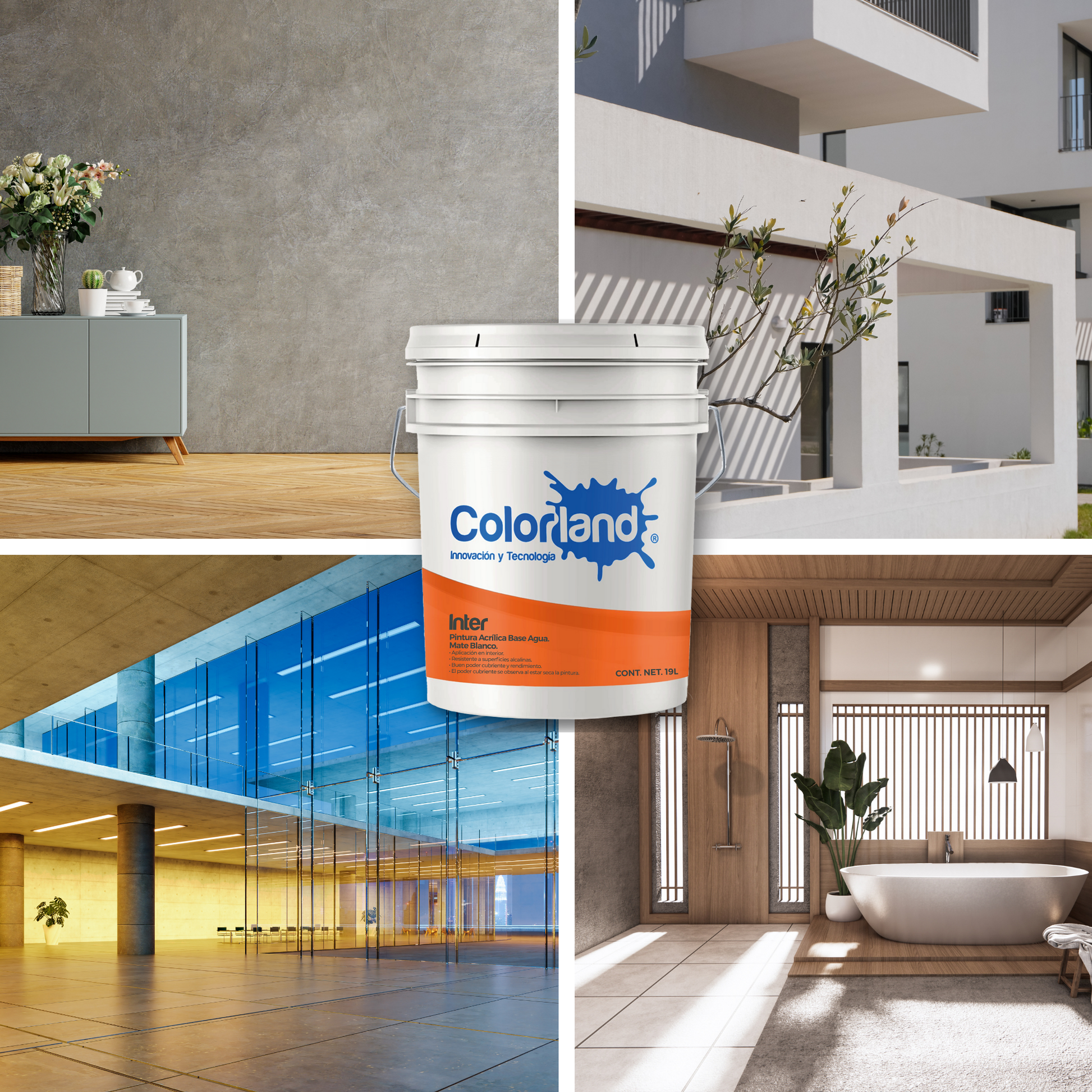 Colorland® Inter es una pintura arquitectónica acrílica desarrollada para interiores de alto tráfico. Su fórmula con polímeros avanzados y pigmentos resistentes brinda acabados lavables y duraderos, sin afectar la salud del ambiente al ser libre de metales pesados.