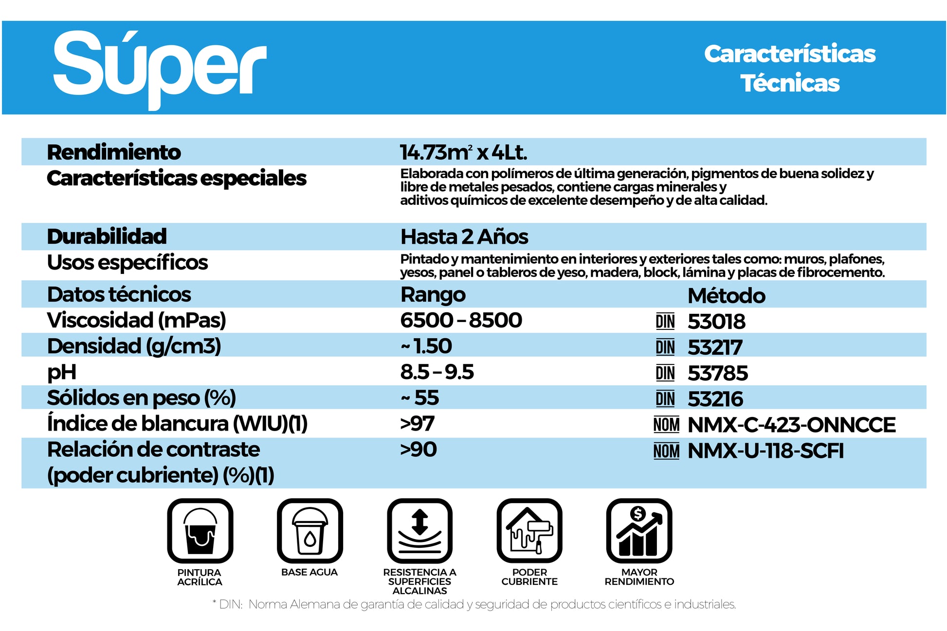 Diseñada para interiores y exteriores, esta pintura mate ofrece un acabado profesional, ideal para muros, plafones, yeso, madera, block y más. Su fórmula innovadora proporciona una excelente adherencia, alto poder cubriente y resistencia a la formación de algas y hongos, incluso en climas húmedos o alcalinos.