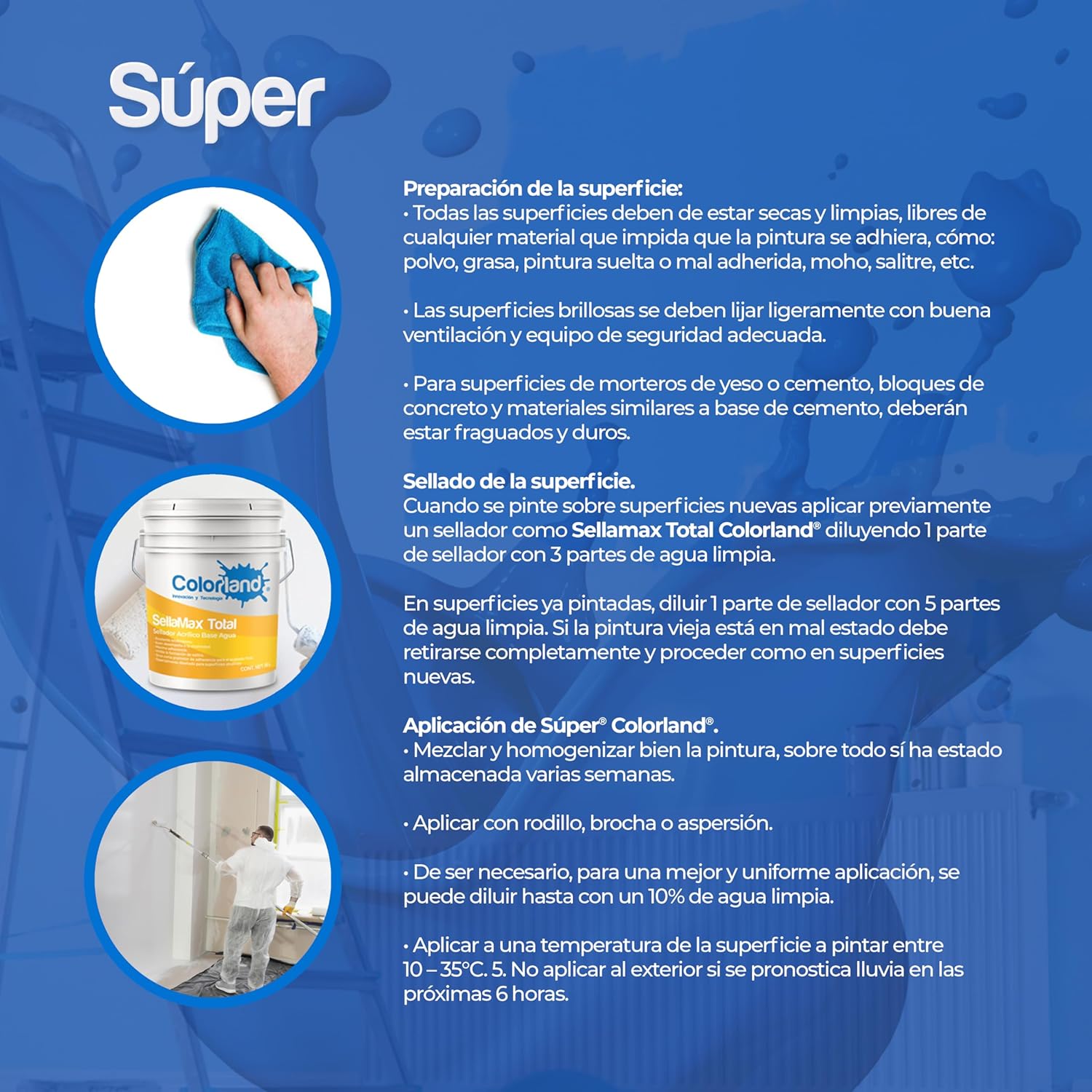 Sellado de la superficie. Cuando se pinte sobre superficies nuevas aplicar previamente un sellador como Sellamax Total Colorland® diluyendo 1 parte de sellador con 3 partes de agua limpia. En superficies ya pintadas, diluir 1 parte de sellador con 5 partes de agua limpia. Si la pintura vieja está en mal estado debe retirarse completamente y proceder como en superficies nuevas