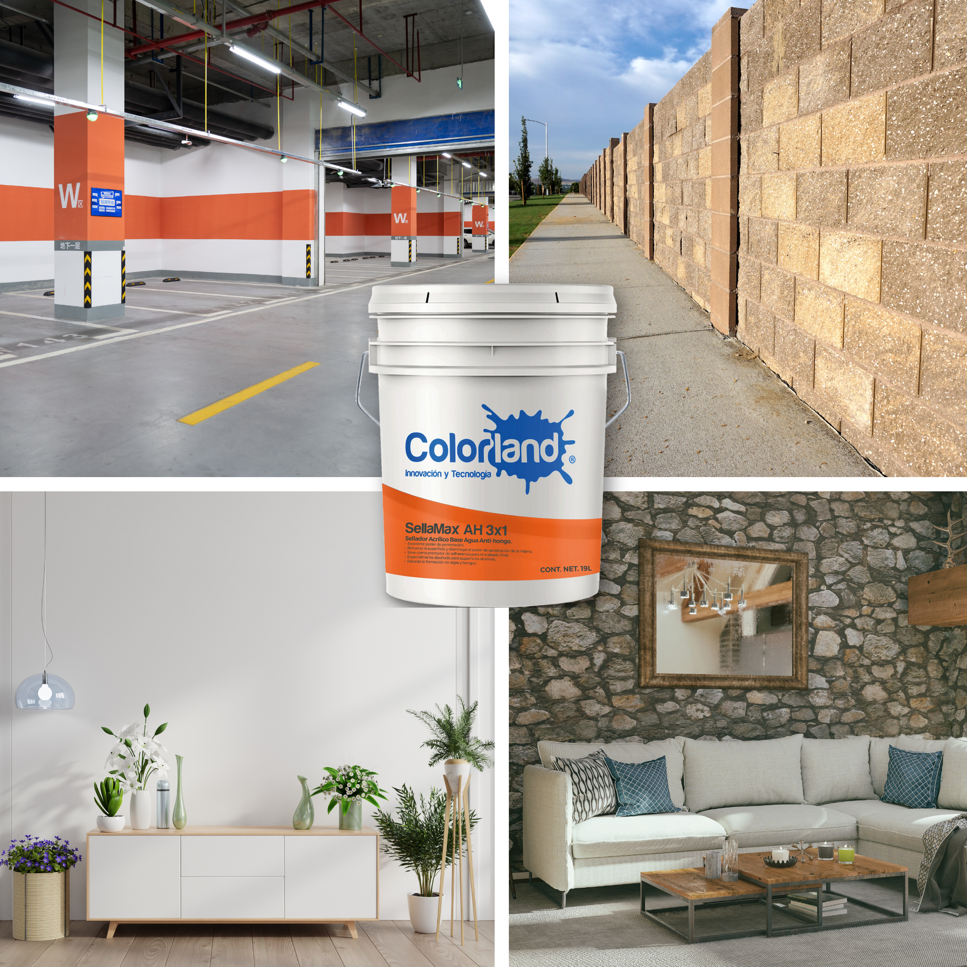 SellaMax AH ColorLand® es un sellador acrílico base agua, líquido diluible 1 x 1 o 3 x 1 en agua limpia, elaborado con resinas solubles en agua, aditivos anti hongos y anti algas, y varios aditivos químicos de última generación.